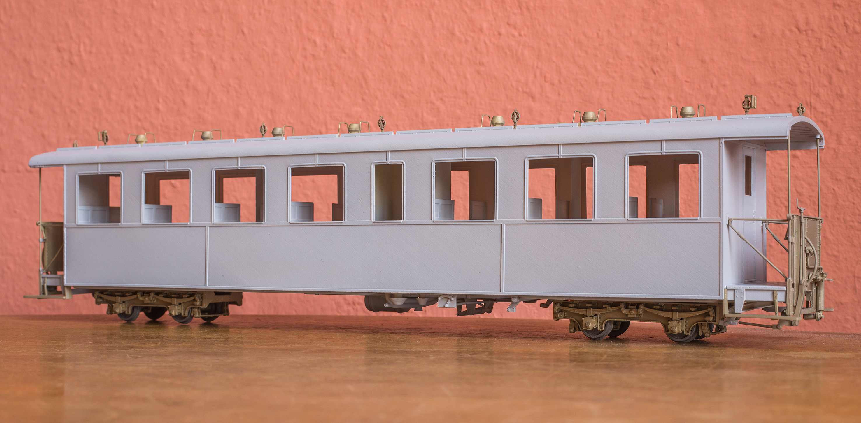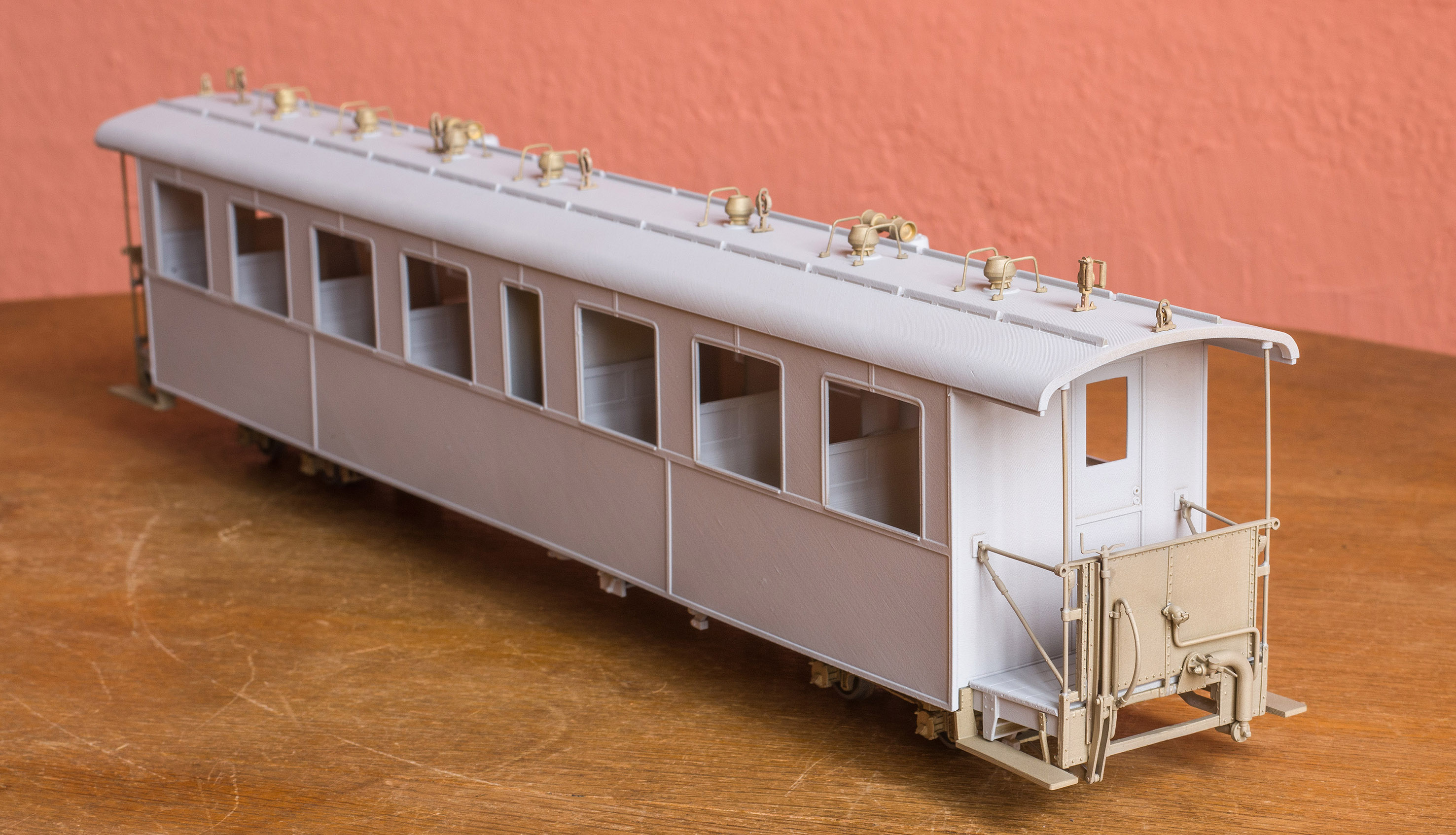 Einheitspersonenwagen für Schmalspurbahnen in der Spurweite 1e im Maßstab 1:32. Der Wagen hat eine Länge ohne Kupplungen von 430mm. Der Bausatz beinhaltet passgenaue aus ABS gedruckte Gehäuse- und Fahrwerksteile, Drehgestelle, Kupplungen und Anbauteile in Messingfeingußausführung, Radsätze beidseitig profiliert und als Drehteile ausgeführt. Inkl. sämtlicher Ätzteile, Fenstereinsätze und Beschriftung für Epoche II bis IV. Ebenso enthält der Bausatz eine ausführliche Bauanleitung.