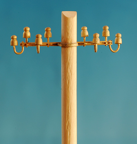 Isolatorentraverse, 8-fach für Telegrafenleitungen, 5 Stück. Zur Verwendung an Telegrafenmasten. Spannbanddurchmesser 6mm. Messingguss. Warnhinweise zu diesem Produkt: Maßstabs- und Originalgetreues Kleinserienmodell für erwachsene Sammler und Modellbauer. Der Artikel darf nicht in die Hände von Kindern unter 14 Jahren gelangen.
